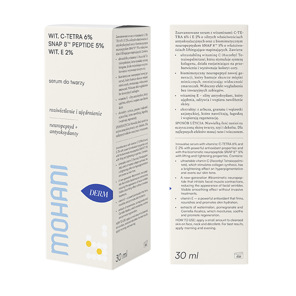 Serum o lekkiej konsystencji łączy w sobie siłę antyoksydantów - ultrastabilnej witaminy C (C-TETRA 6%) oraz witaminy E (2%) z biomimetycznym neuropeptydem SNAP 8™ Peptide (5%), który działa liftingująco i napinająco na skórę.